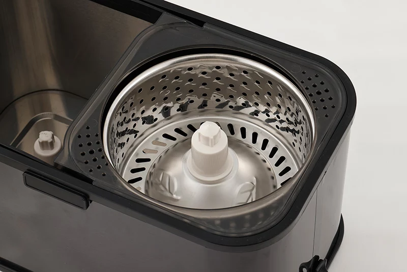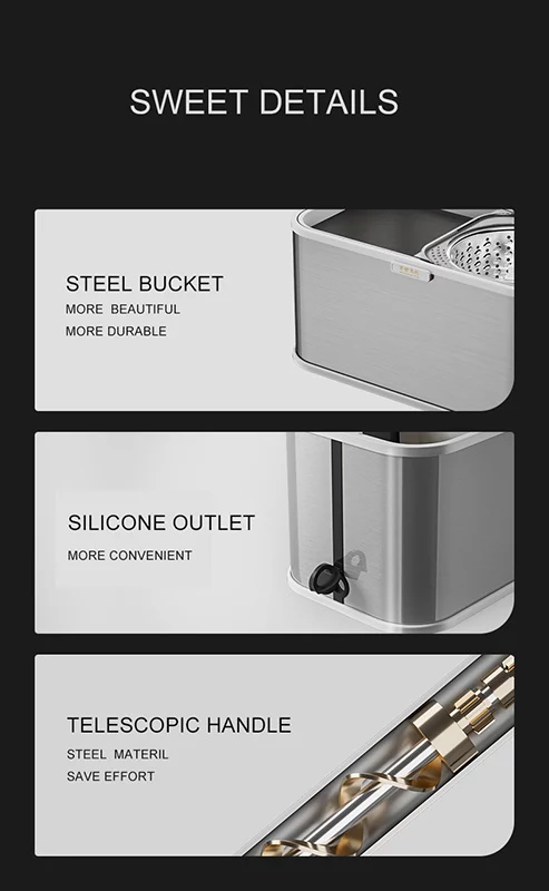 تی مقاوم و بادوام !! این تی با قابلیت شستشو و خشک کردن در دو مرحله فقط با چرخش کفه تی و بالا و پایین بردن دسته تی کاربد آن را بسیار آسان میکند . این تی با اندازه مناسب و حجم کافی ، بیشترین کاربرد را دارا میباشد . مکانیزم کارکرد این است مه با پرکردن اب درون مخزن تا سطح علامت گذاری شده ، تی را درون سطل گذاشته و با فشار دادن آن بر روی محور قسمت شستشوی سطل آن را مرطوب و شستشو نمایید.هر بار و با فشار بروی دسته قابلیت چرخشی را تکرار کنید . و برای آبگیری کامل آن را در سبد استیل آبگیر قرار داده و با استفاده از قابلیت چرخشی دسته آب را با بیشترین سرعت خشک نمایید ، دریچه خروجی آب تعبیه شده امکان خروج آب کثیق ناشی از شستشو را برای شما فراهم میکند.بدنه فوق با کیفیت استیل نگیر و طراحی زیبا همه ی چشم ها را به خود مجذوب میکند.